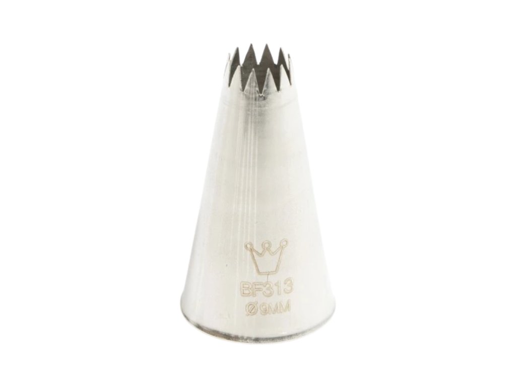 Průměr otvoru 9 mm, typ zubatá, tvar francouzská hvězda, materiál nerez, profesionální cukrářská zdobicí špička.